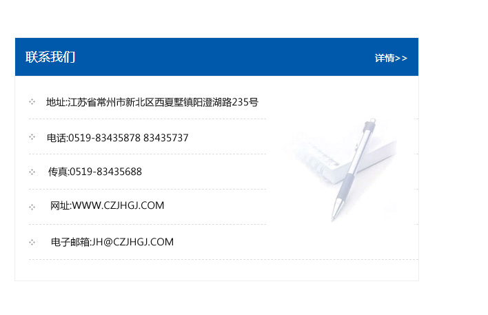 地址:常州市新北區友邦商務大廈1幢16、17層  電話:0519-85101652  傳真:0519-85112595  郵編:213022  網址:www.cz-jiayue_cn.ykyouxi.com  郵箱:xiajifengaa@163.com